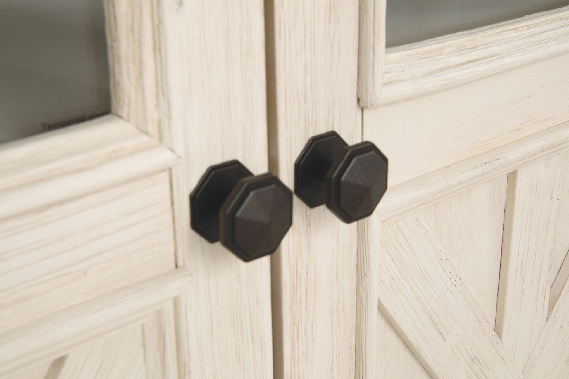 Whether your style is farmhouse fresh, shabby chic or country cottage, you’ll find this extra large TV stand perfectly in tune. Its two-tone, gently distressed finish pairs weathered oak with antiqued white for that much more quaint character. Charming elements include crossbuck adorned cabinets with glass inlays for peek-through flair. Ample adjustable shelving and cutouts for wire management nicely accommodate your media needs.