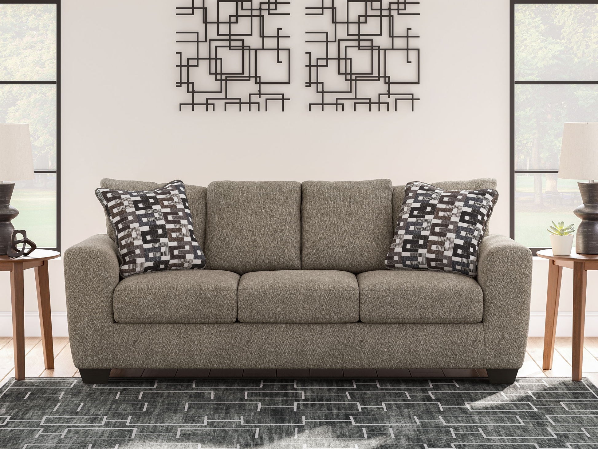 Transitional and right on trend. This queen sleeper sofa’s upholstery is a delightful change from the ordinary, with hints of soft brown giving the gray hue added depth. A built-in memory foam mattress easily pulls out to accommodate overnight visitors. It’s punctuated with chic accent pillows in an eye-catching, stylized stripe design. Whether you're hosting friends and family or relaxing solo, this sleeper sofa invites homey, comfortable character into your space.