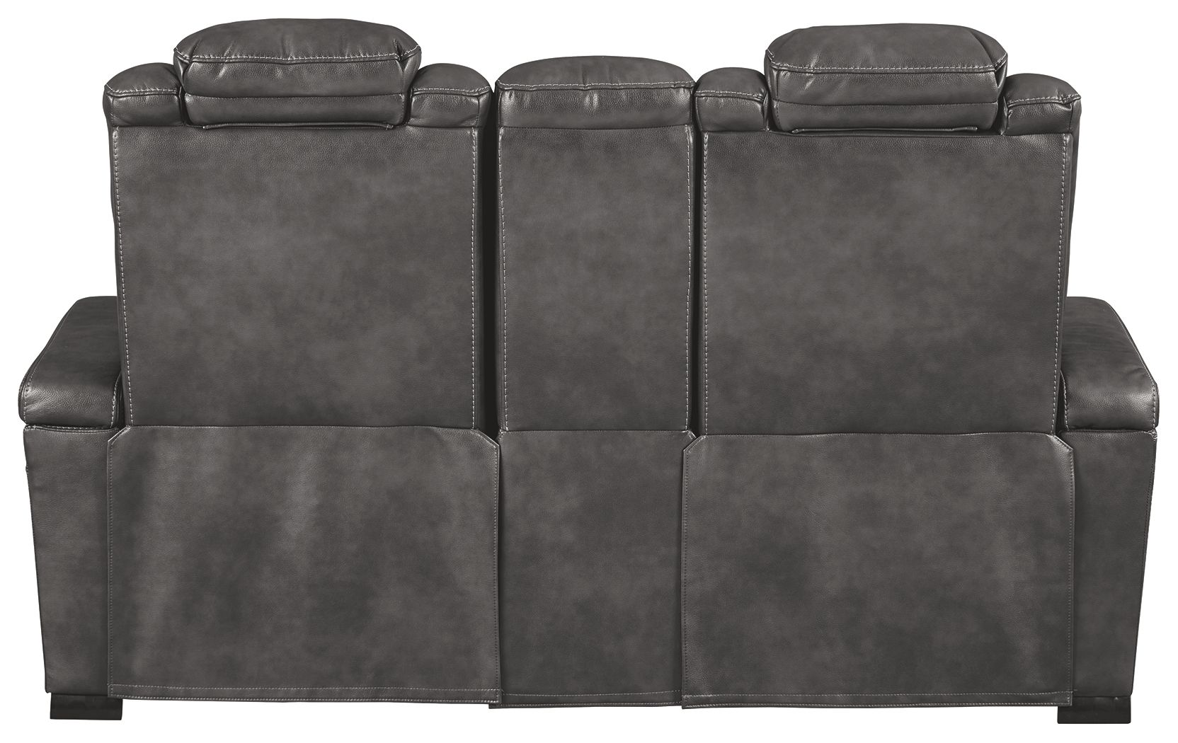 Looking for seating with all the bells and whistles? This loaded power reclining loveseat has you covered. Get double the relaxation—recline your body then adjust your headrest. Pull up the center console to stash your remotes. With USB charging ports, your devices will enjoy this loveseat, too. With four stainless steel cup holders, you’ll have drinks galore. All wrapped up in quality faux leather with fashion-forward jumbo stitching for a look and feel you’ll love.