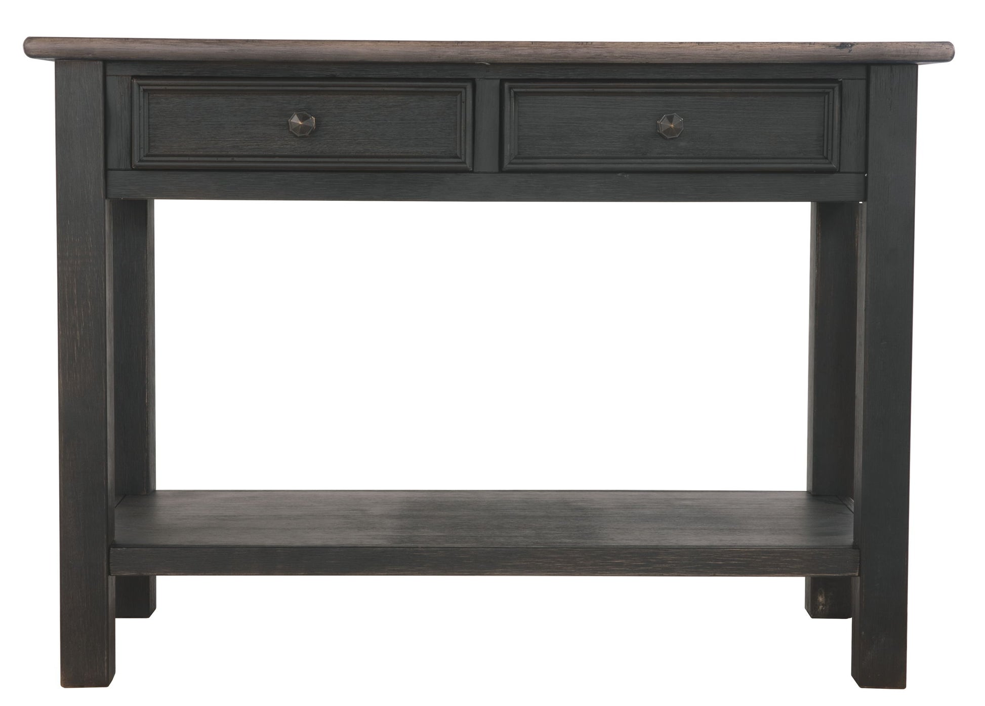 Shabby chic with a hint of down-home country, this sofa table is all the talk of today’s design world. Wood grain shows through the weathered gray-brown top in all of its earthy pleasure. And the framed drawers, adorned with lovely traditional hardware, make it easy for you to store your belongings in style.